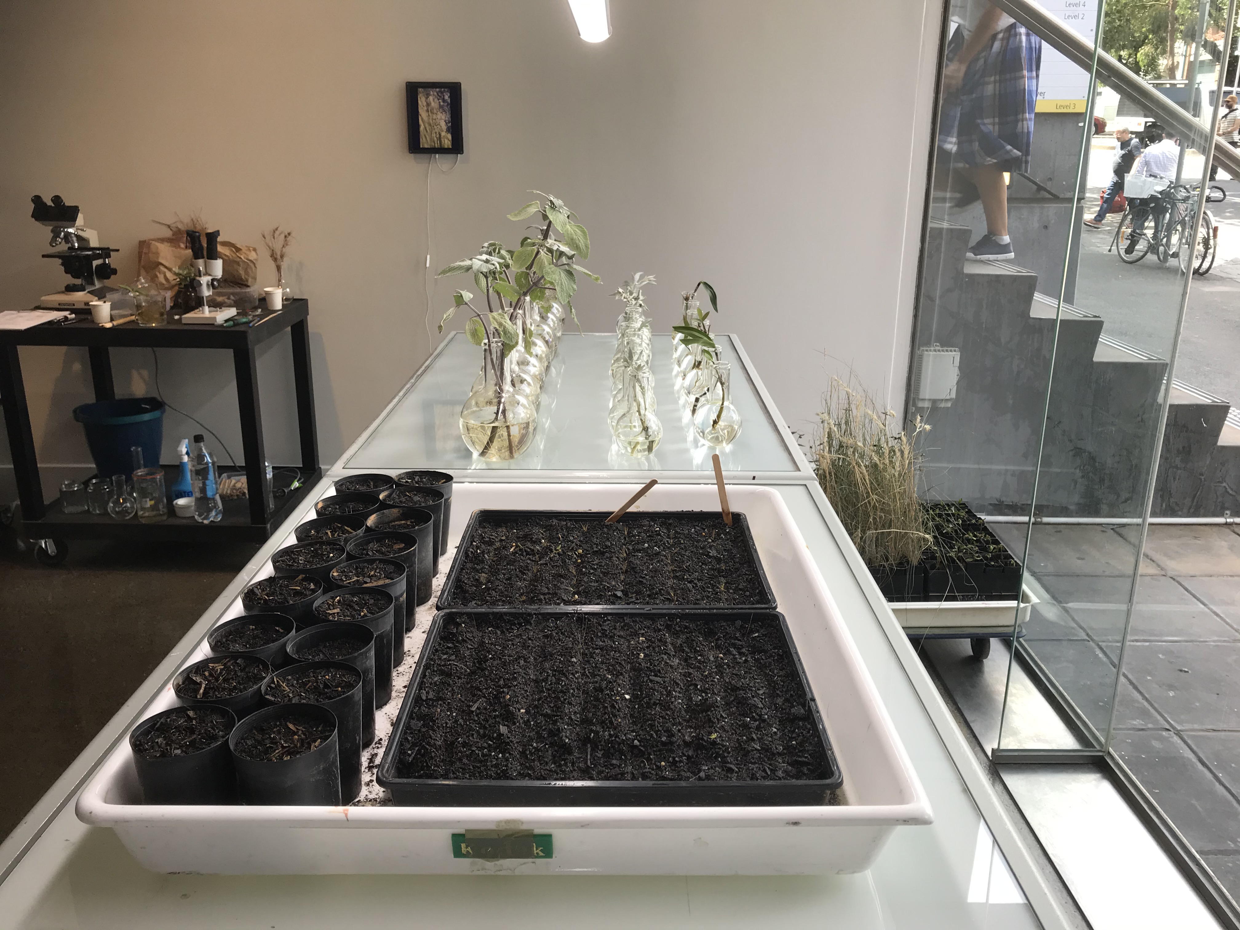 My contribution to Posthuman PUBLICS was CULTIVATE an interactive work involving the care, propagation and cultivation of seeds and tubestock growing for the duration of the project. Plant and seed species could be examined under the microscope, were germinated by participants, cared for and eventually gifted away to new homes. Species included: Murnong Yam Daisy (Microseris lanceolata), Hickory Wattle, Lightwood (Acacia implexa), Silver Wattle (Acacia dealbata), Silver Spurflower (Plectranthus argentatus), Common correa (Correa reflexa var reflexa), Grey Saltbush(Atriplex cinerea) and Common tussock grass (Poa labillardiereri), among others. For a full list of species and cultivation notes see below.