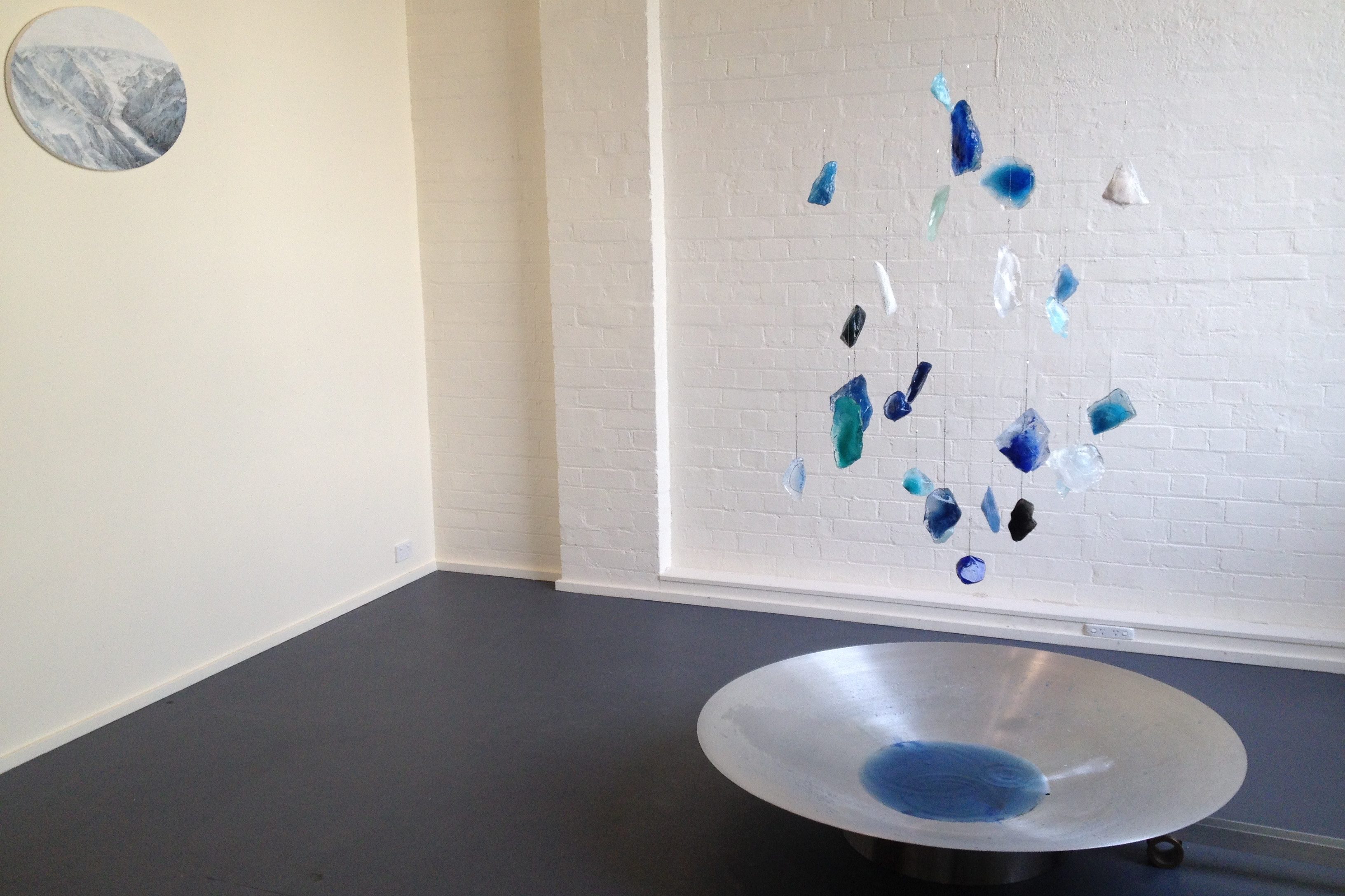 Shown as part of The Warming, curated by Mandy Martin as part of the Art+Climate=Change festival held in May 2015 in Melbourne, Victoria. This event featured more than 20 galleries plus talks by David Buckland and Bill Fox. Slow Melt is a time-based installation by, that over 22 days charts several global and local freshwater ways, from glacial sources, lakes, rivers and confluence through to delta systems. The importance of regular seasonal glacial melts is vital for river systems supplying water as a source for drinking, agriculture, fishing, transportation, hygiene, habitats, maintaining healthy ecologies and beneficial flow.
