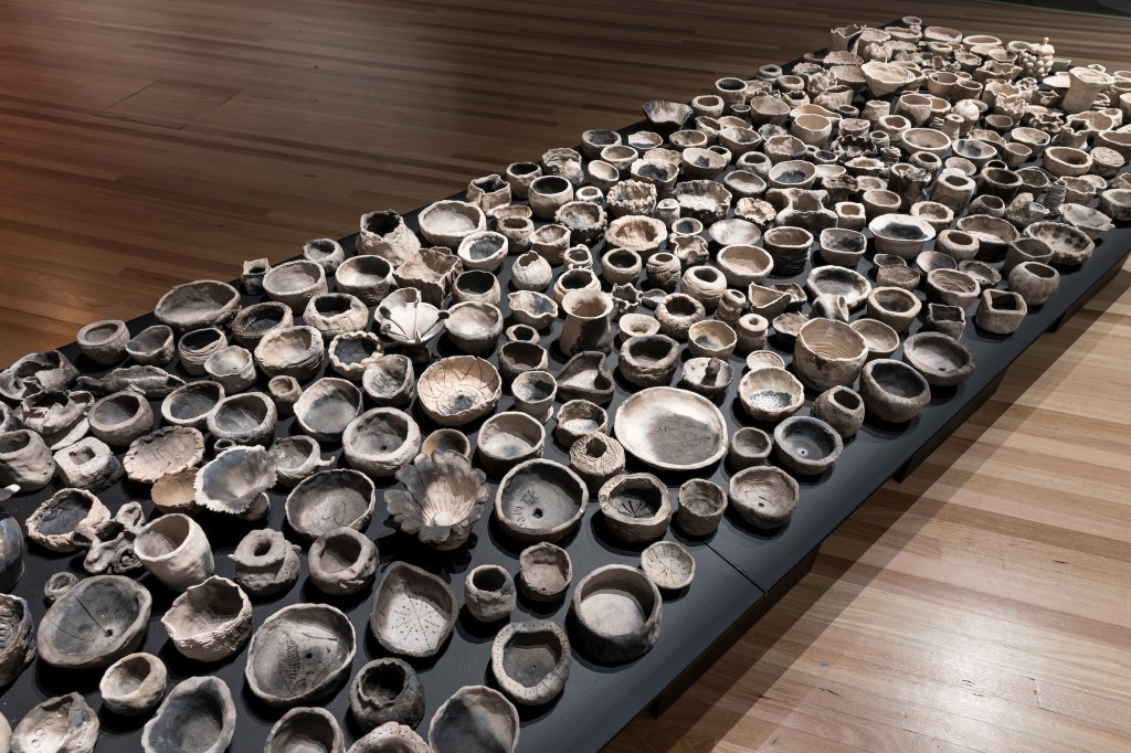 I am grateful to everyone who made a pot for BUILT, for without your contribution this project would not have been realized. A big thank you to the communities of Wyreena Community Arts Centre, Croydon, Maroondah, Eastern View, Airey’s Inlet, Anglesea, and Spensley Street Primary School, Clifton Hill. Lauris Grant and curator Lisa Byrne have been instrumental in creating classes, workshops and bisque firings. Thank you to RMIT PIP Print Studio, Martin Swanson from WildTech Nursery, the installation staff at ArtSpace, Charlotte Carter and John Waters for the many bags of sawdust. Melinda Lewis and Strobe Driver assisted Dr Dawn Whitehand, who generously created a specific pit firing for these pots.