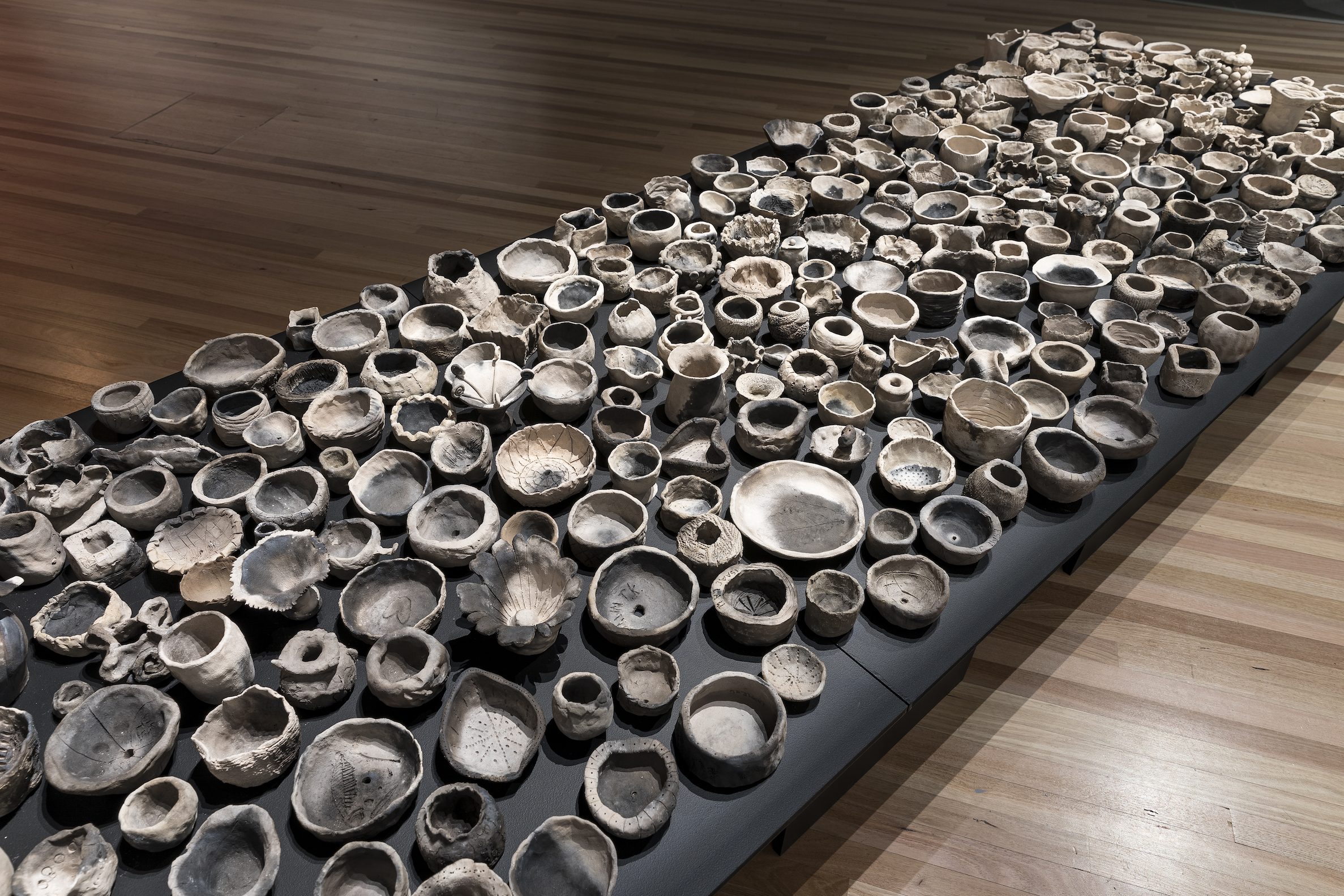 I am grateful to everyone who made a pot for BUILT, for without your contribution this project would not have been realized. A big thank you to the communities of Wyreena Community Arts Centre, Croydon, Maroondah, Eastern View, Airey’s Inlet, Anglesea, and Spensley Street Primary School, Clifton Hill. Lauris Grant and curator Lisa Byrne have been instrumental in creating classes, workshops and bisque firings. Thank you to RMIT PIP Print Studio, Martin Swanson from WildTech Nursery, the installation staff at ArtSpace, Charlotte Carter and John Waters for the many bags of sawdust. Melinda Lewis and Strobe Driver assisted Dr Dawn Whitehand, who generously created a specific pit firing for these pots.